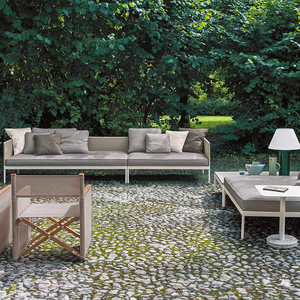 Κάθε στοιχείο είναι κατασκευασμένο από τικ, διαθέσιμο σε φυσικό ή weathered φινίρισμα. Περιλαμβάνει στοιχεία χωρίς πλάτη, γωνιακά και βαθιά για πολλαπλές διαμορφώσεις. Οι υπαίθριες μαξιλάρες έχουν αφαιρούμενα αδιάβροχα υφάσματα και παρέχουν απόλυτη άνεση.